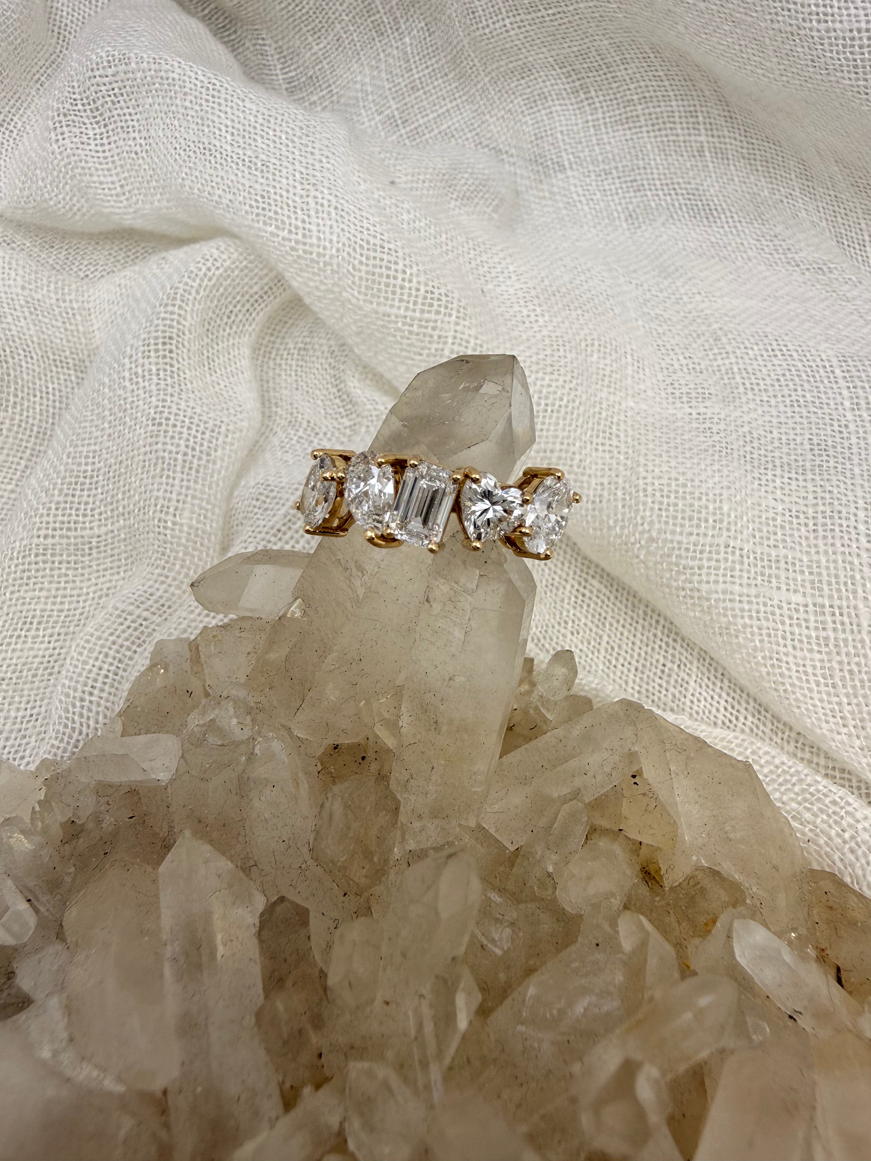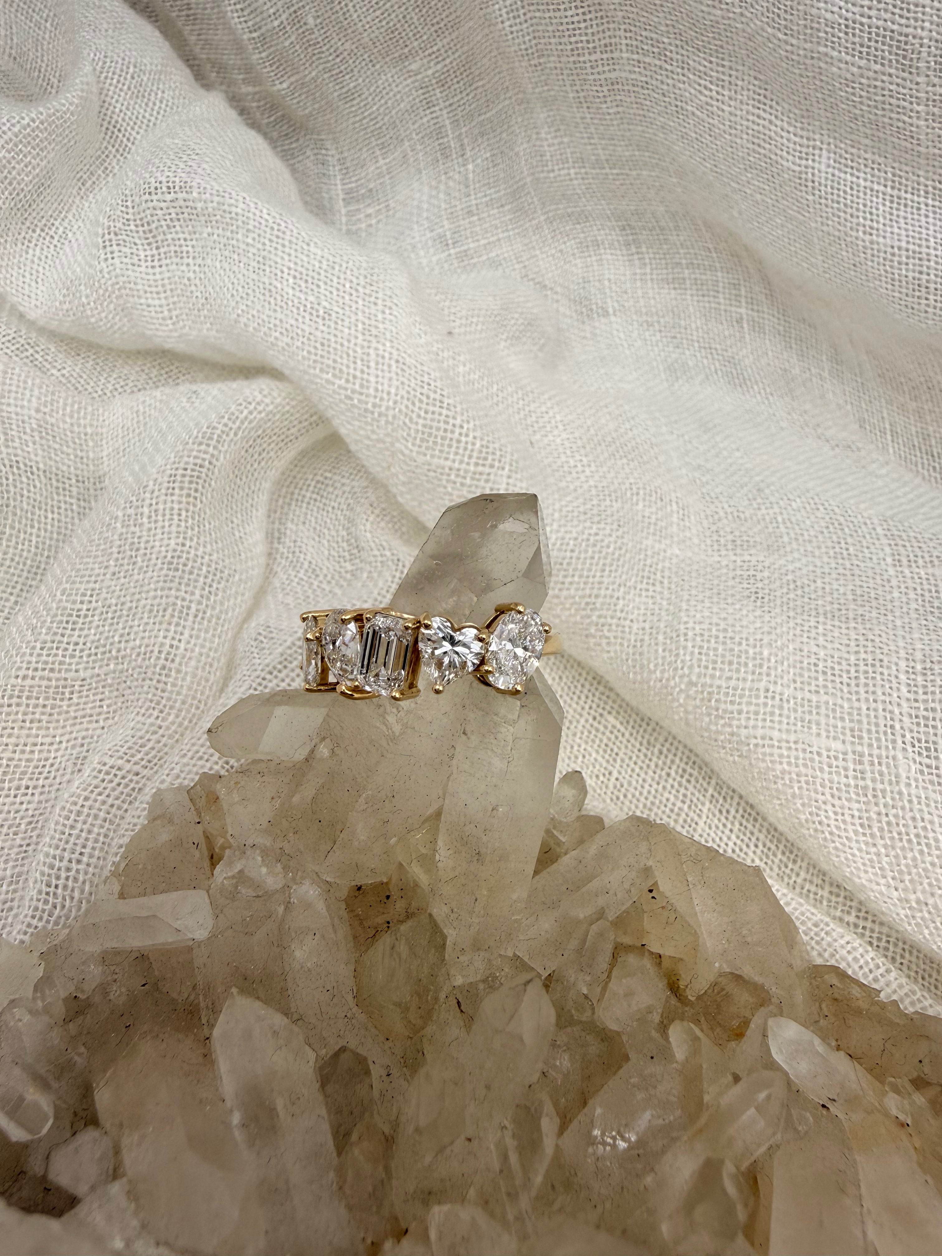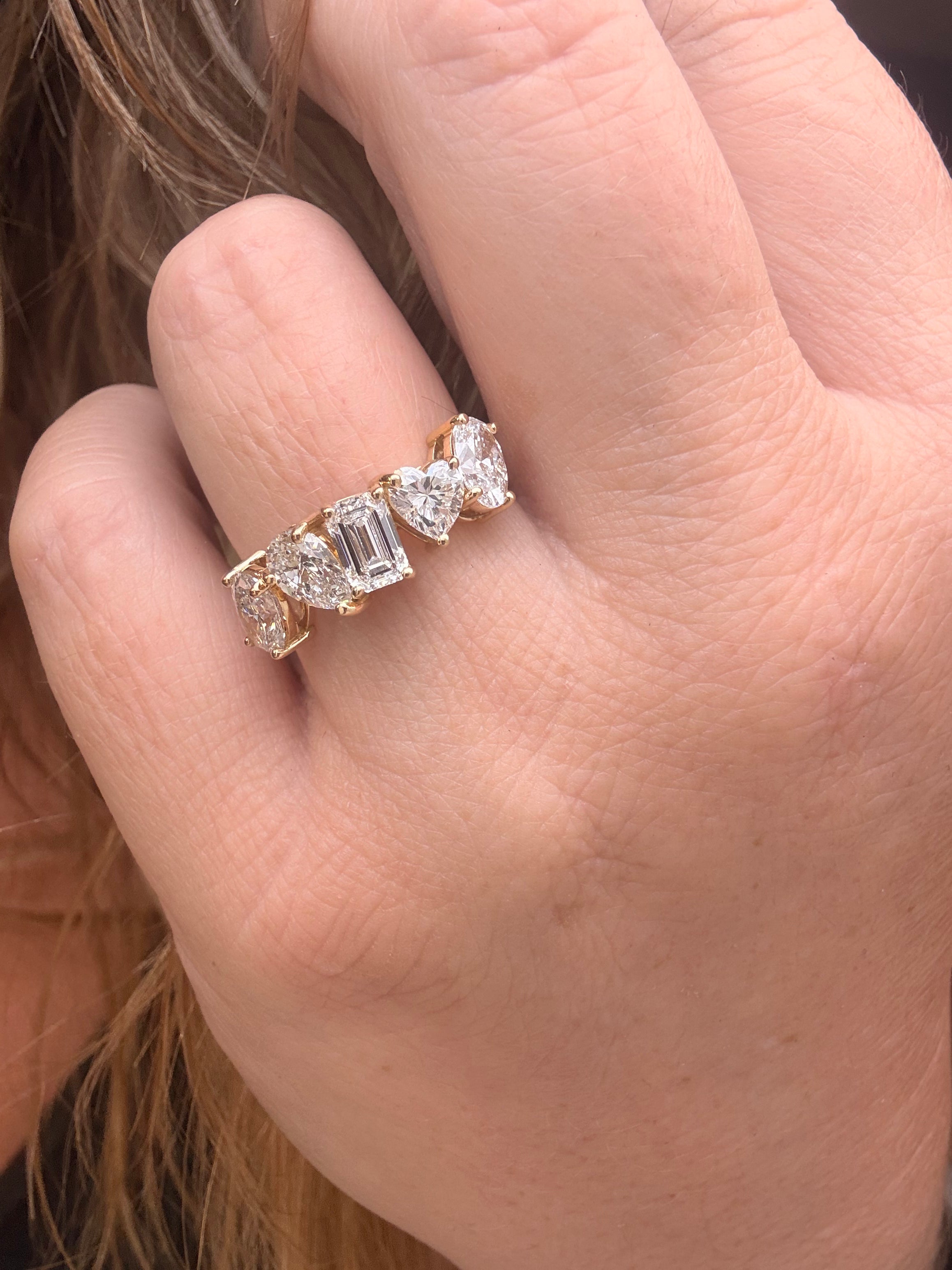 A stunning and eclectic mix of 5x lab grown diamonds in oval, heart, emerald, pear and oval shapes to create this modern version of a half eternity band.
