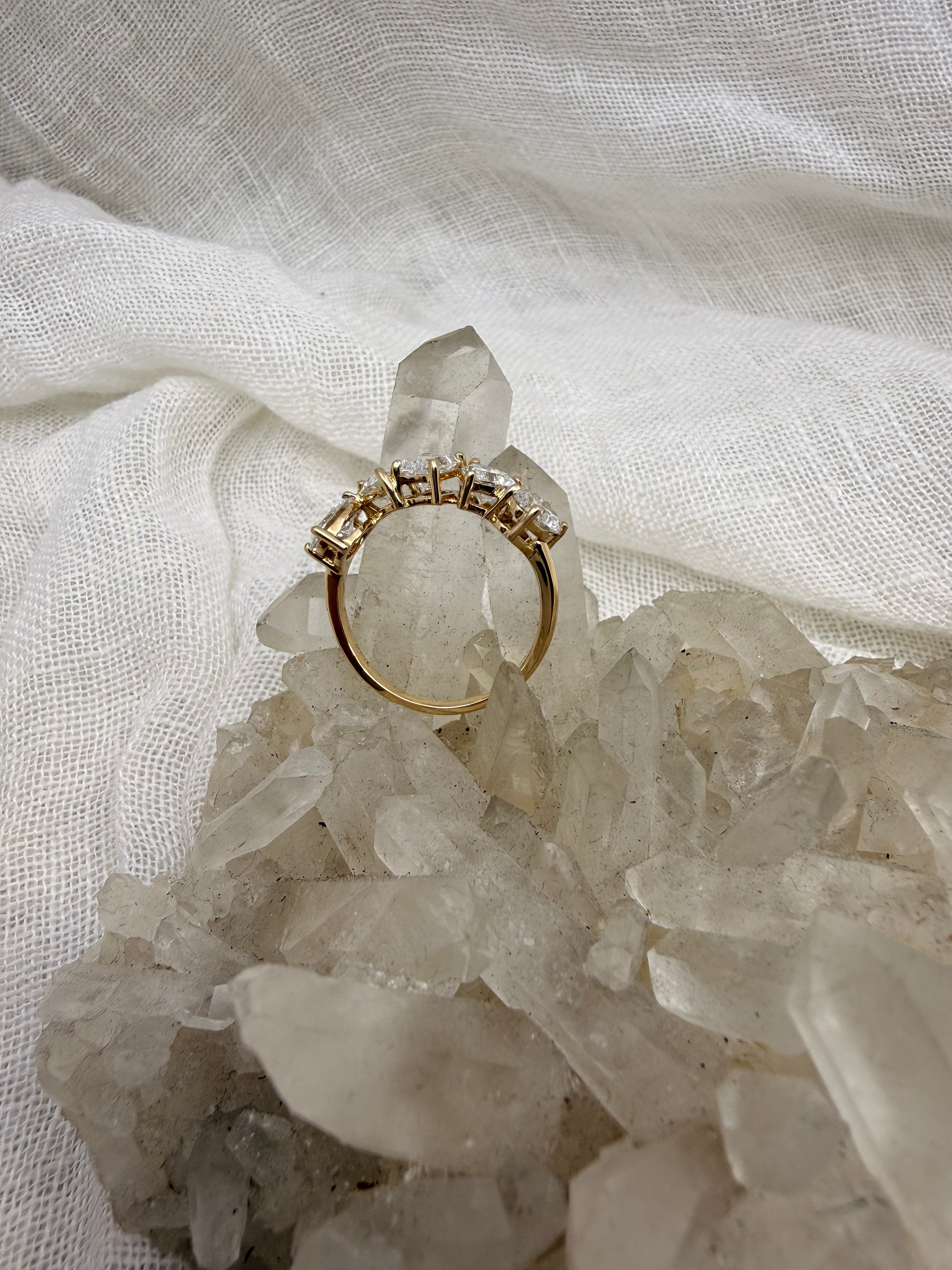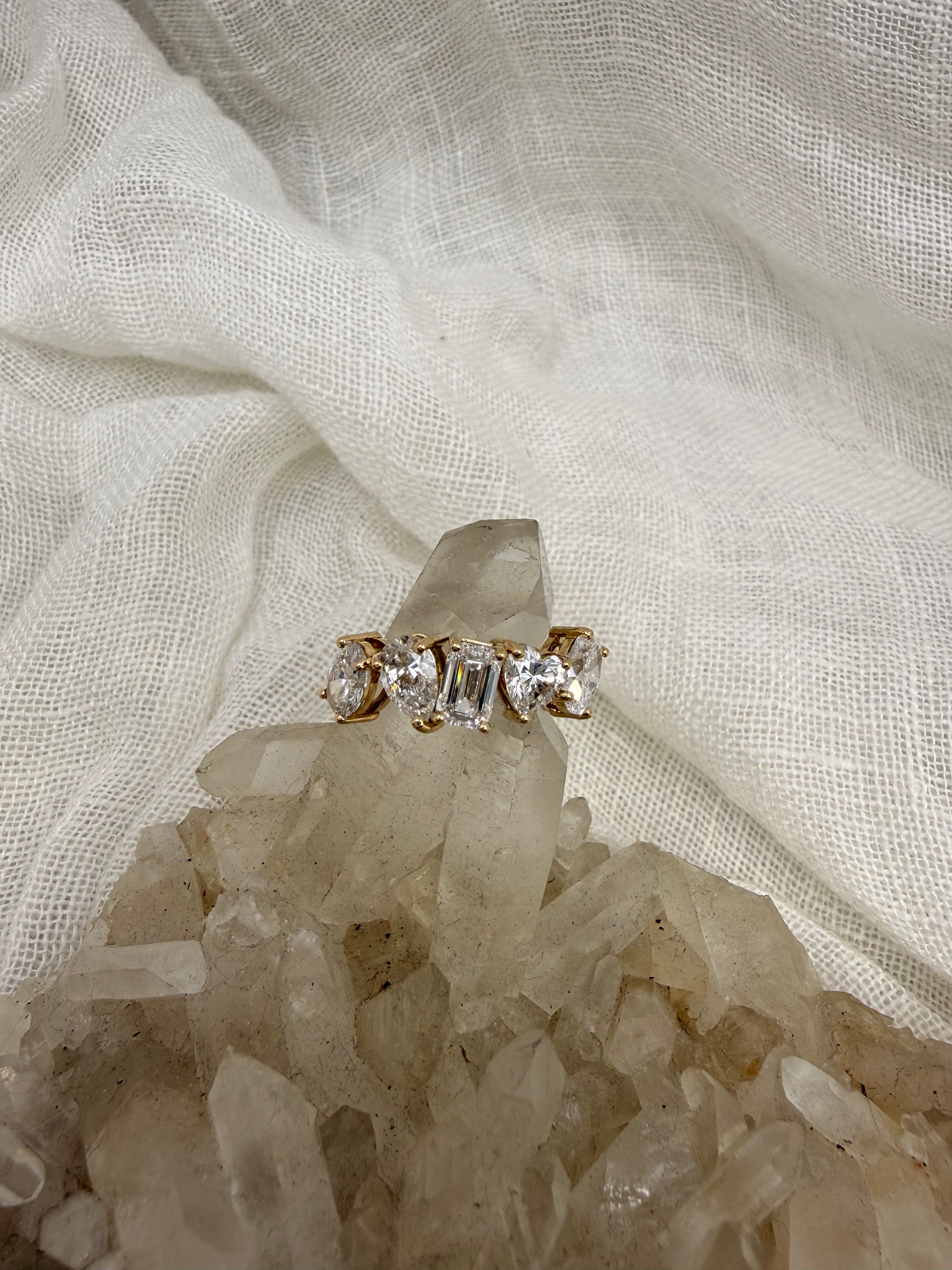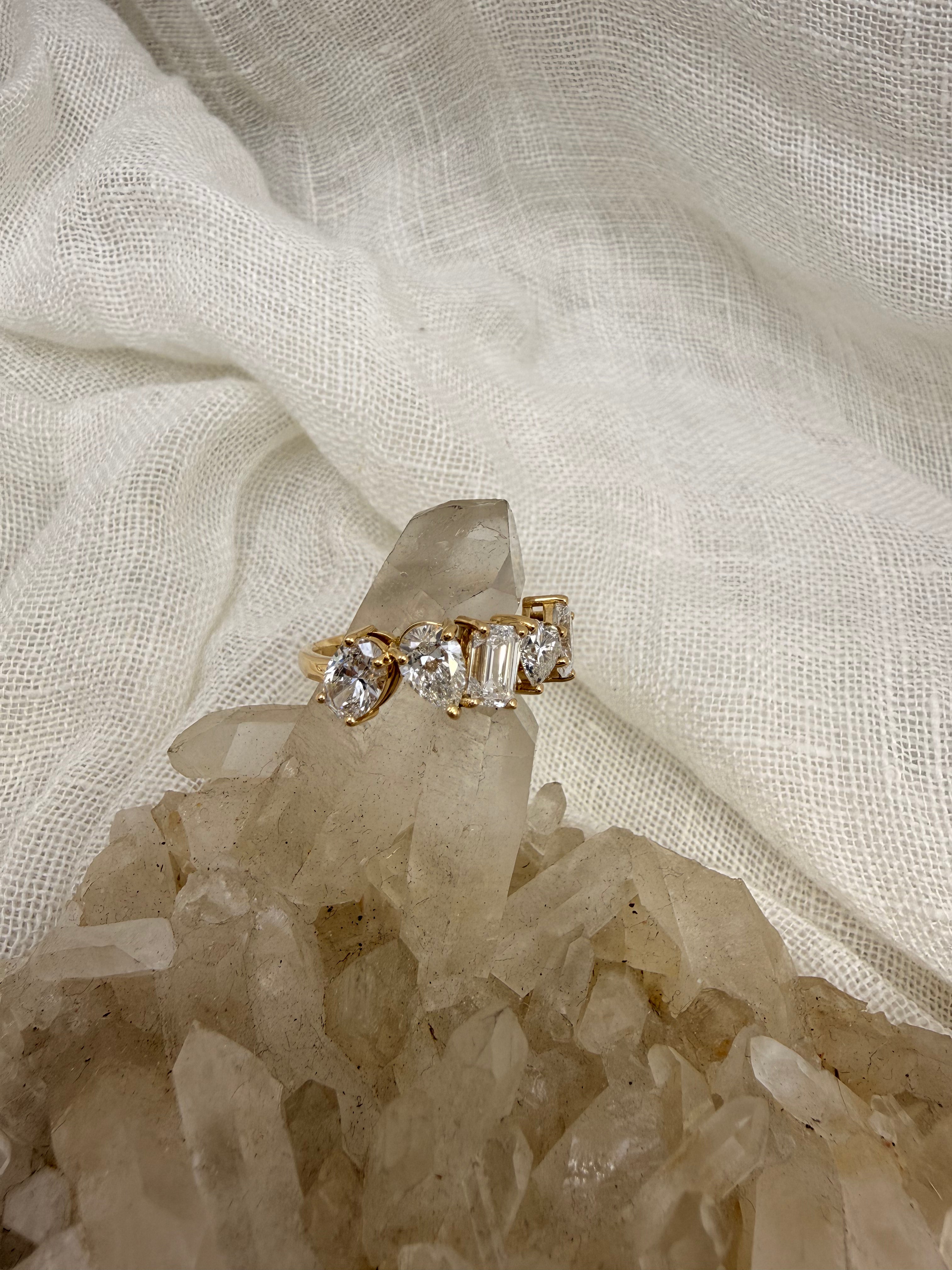 A stunning and eclectic mix of 5x lab grown diamonds in oval, heart, emerald, pear and oval shapes to create this modern version of a half eternity band.