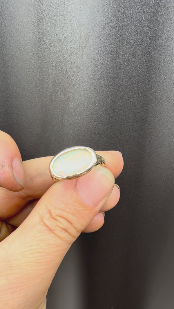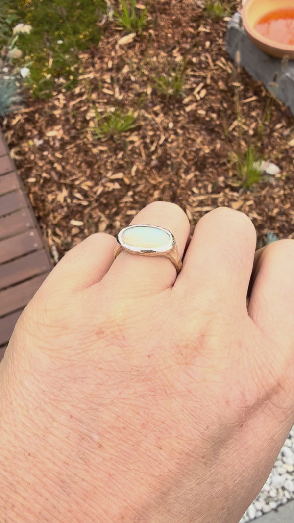 Stunning 1.7ct oval fairy floss coloured solid crystal opal set in an east/west low profile signet style ring, with the classic NVJ texture in 9ct yellow gold. Such a low key statement piece that comes to life in the natural light.