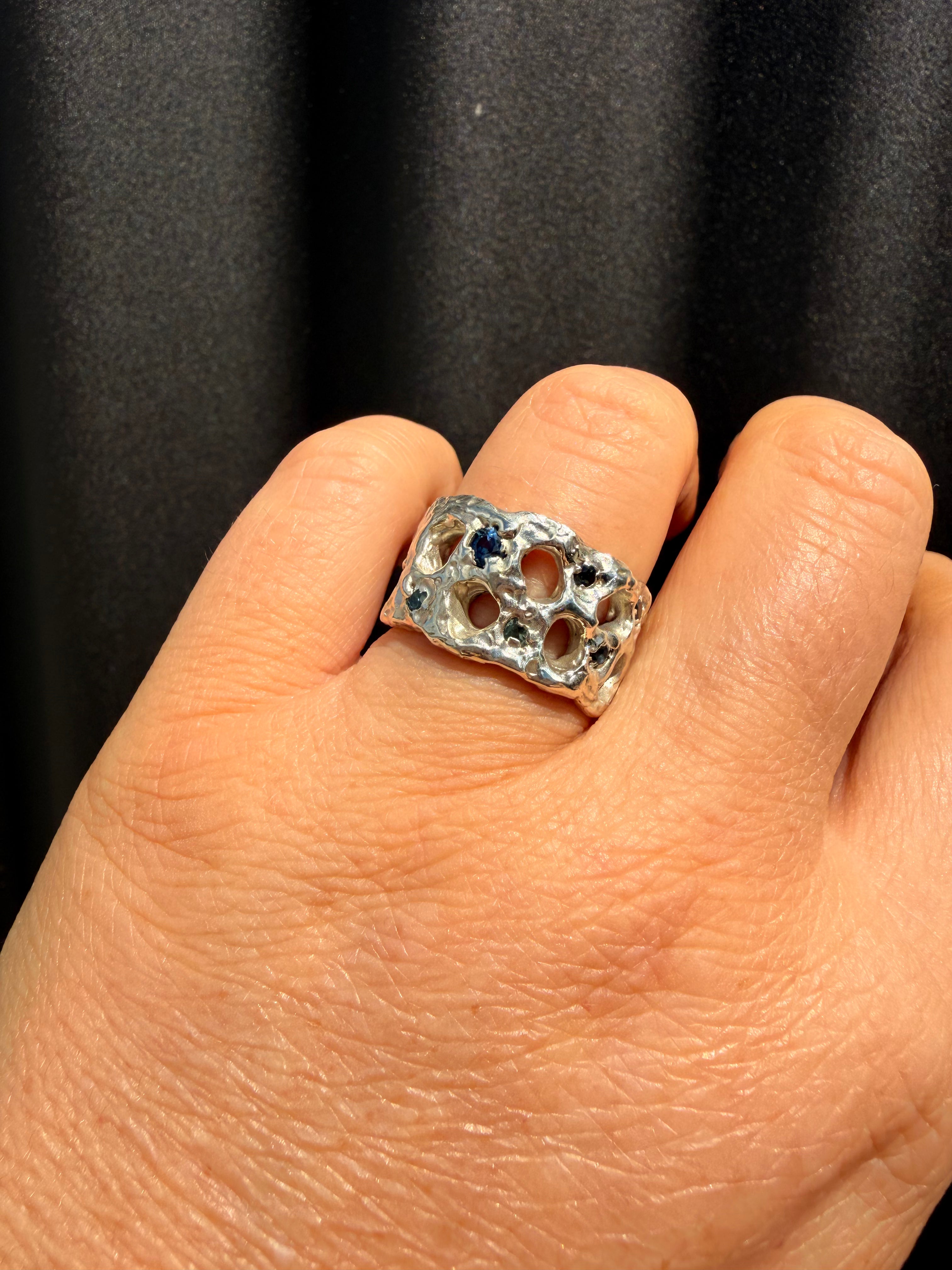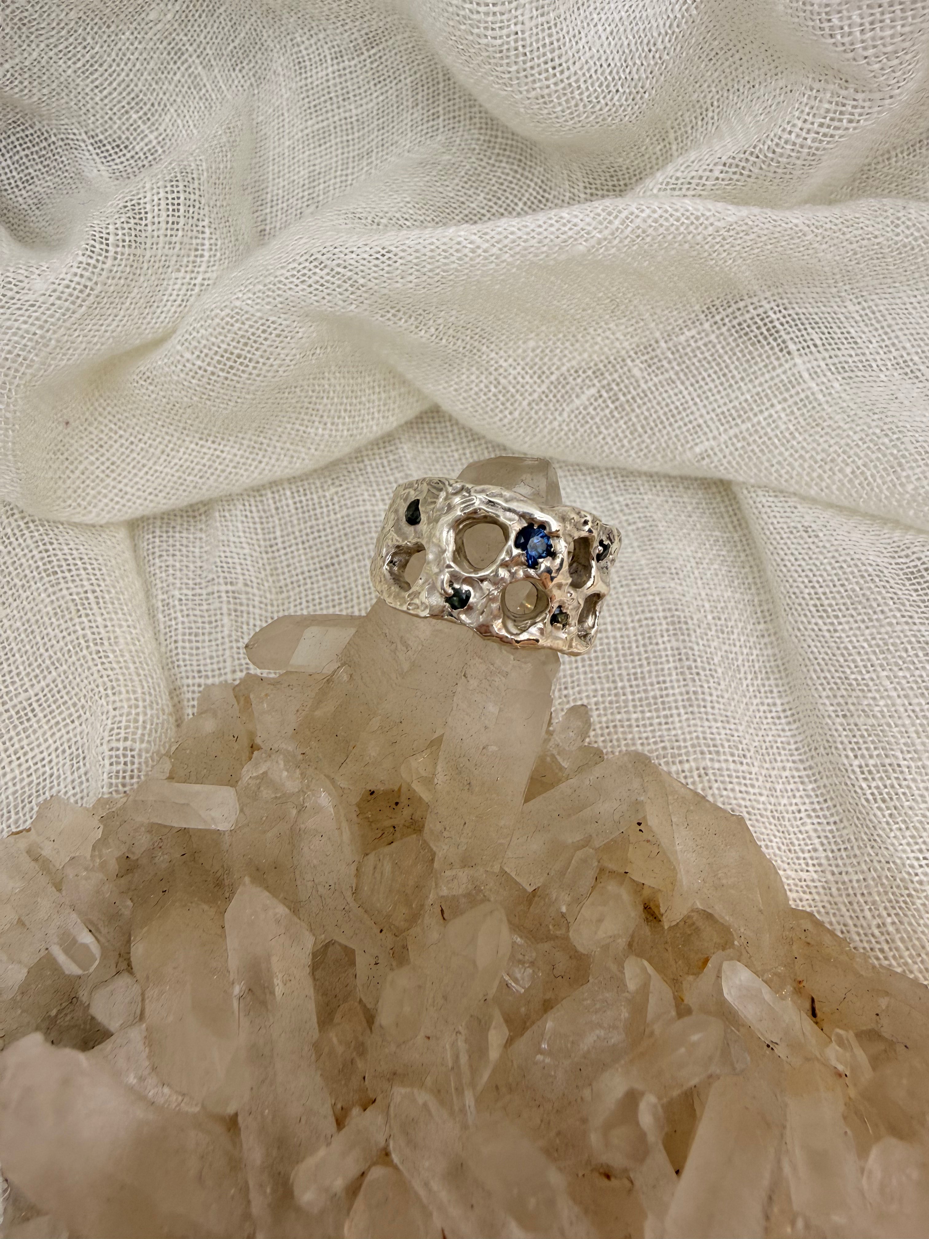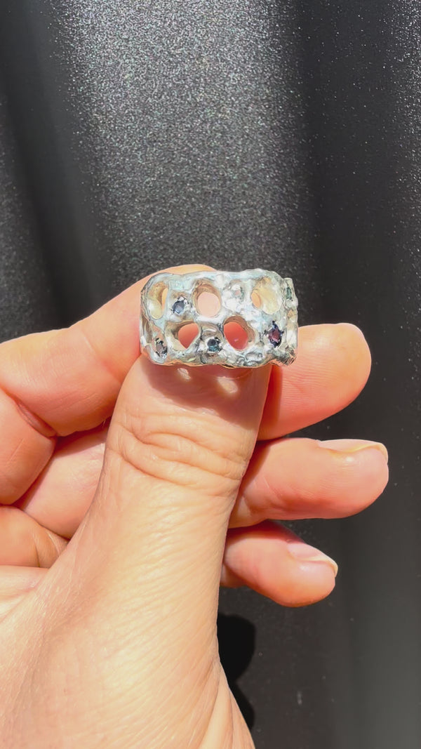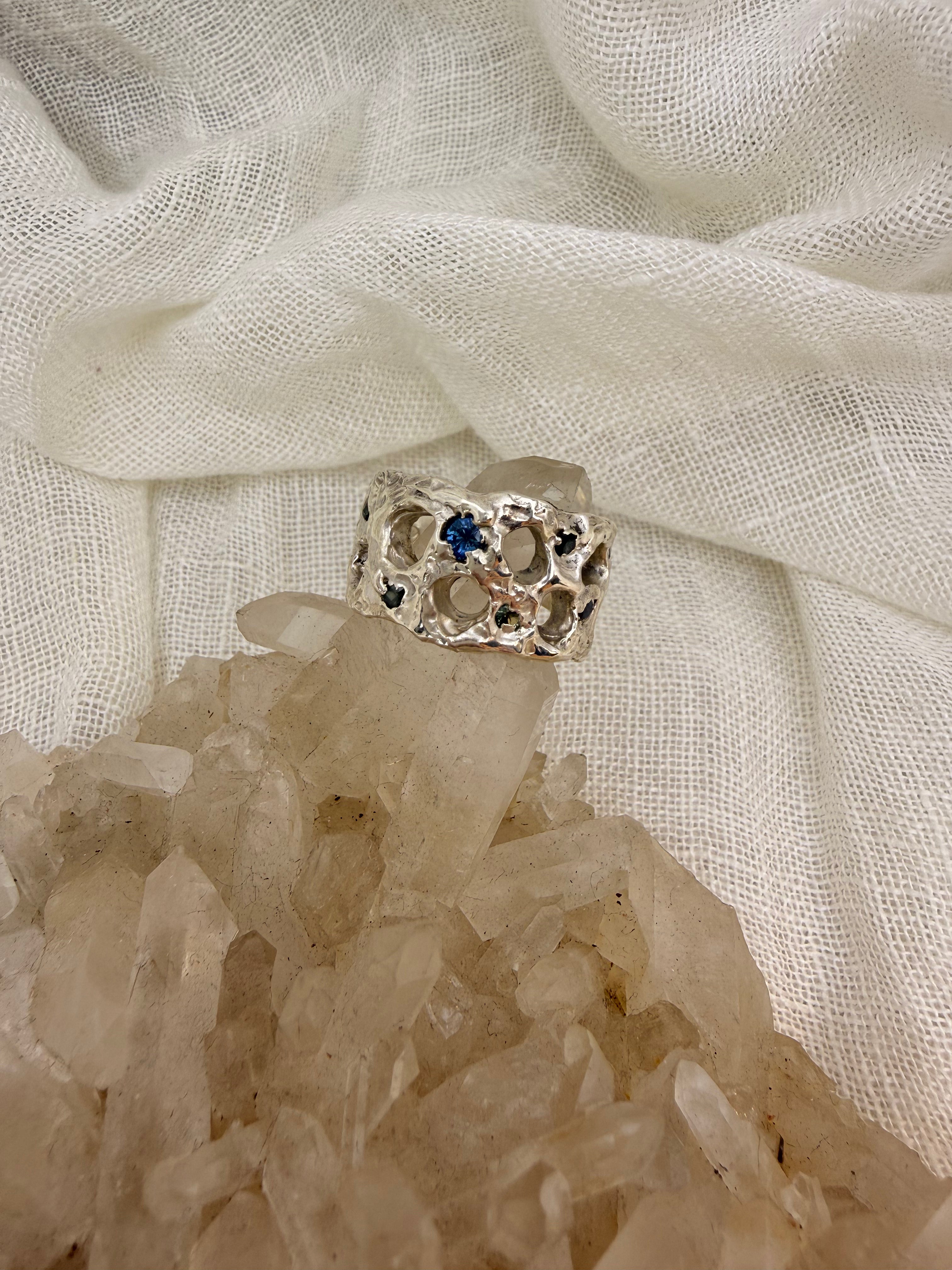 Taking the Rockpool ring into some cooler tones in Sterling silver and spray of blue hues in natural Queensland sapphires, scattered across the surface of the ring. The texture reminiscent of water gently dancing around the the shallows and rock pools in our waterways